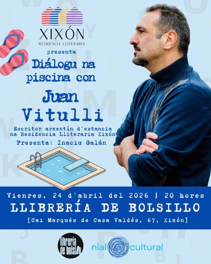 Juan Vitulli, escritor arxentín que ta esfrutando d’una estacia creativa na Residencia Lliteraria Xixón va protagonizar un alcuentru lliterariu’l vienres, 24 d’abril, a les 20 hores, na Llibrería de bolsillo (Xixón).