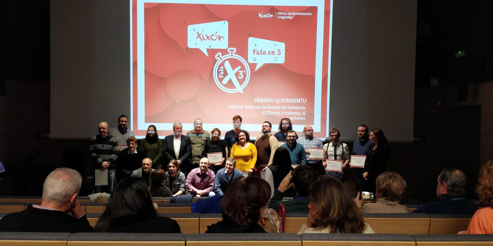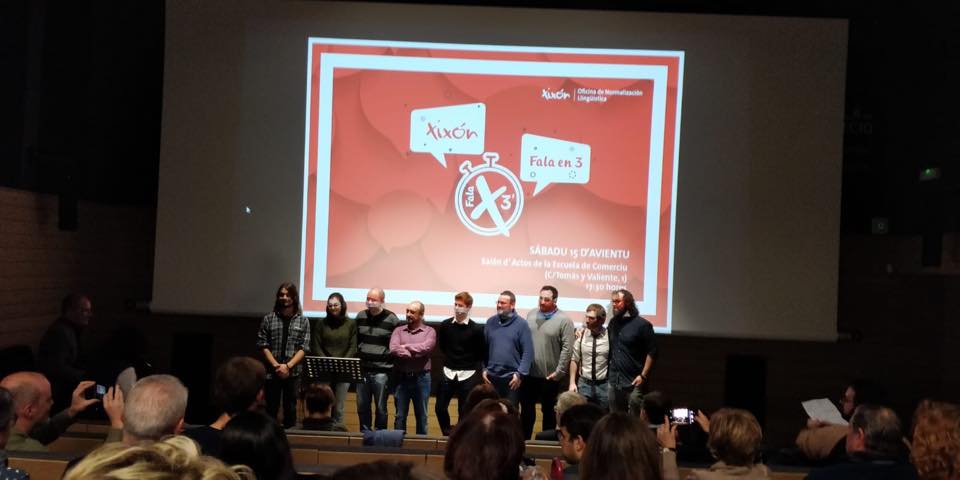 El pasáu sábadu 15 d’avientu celebróse na Escuela de Comerciu de la villa de Xovellanos el I concursu Xixón Fala en 3, una competición n’asturianu dafechu onde se presentaron temes, idees, investigaciones con munchu procuru y con bona calidá llingüística énte un públicu non especializao, xeneralista y variao.